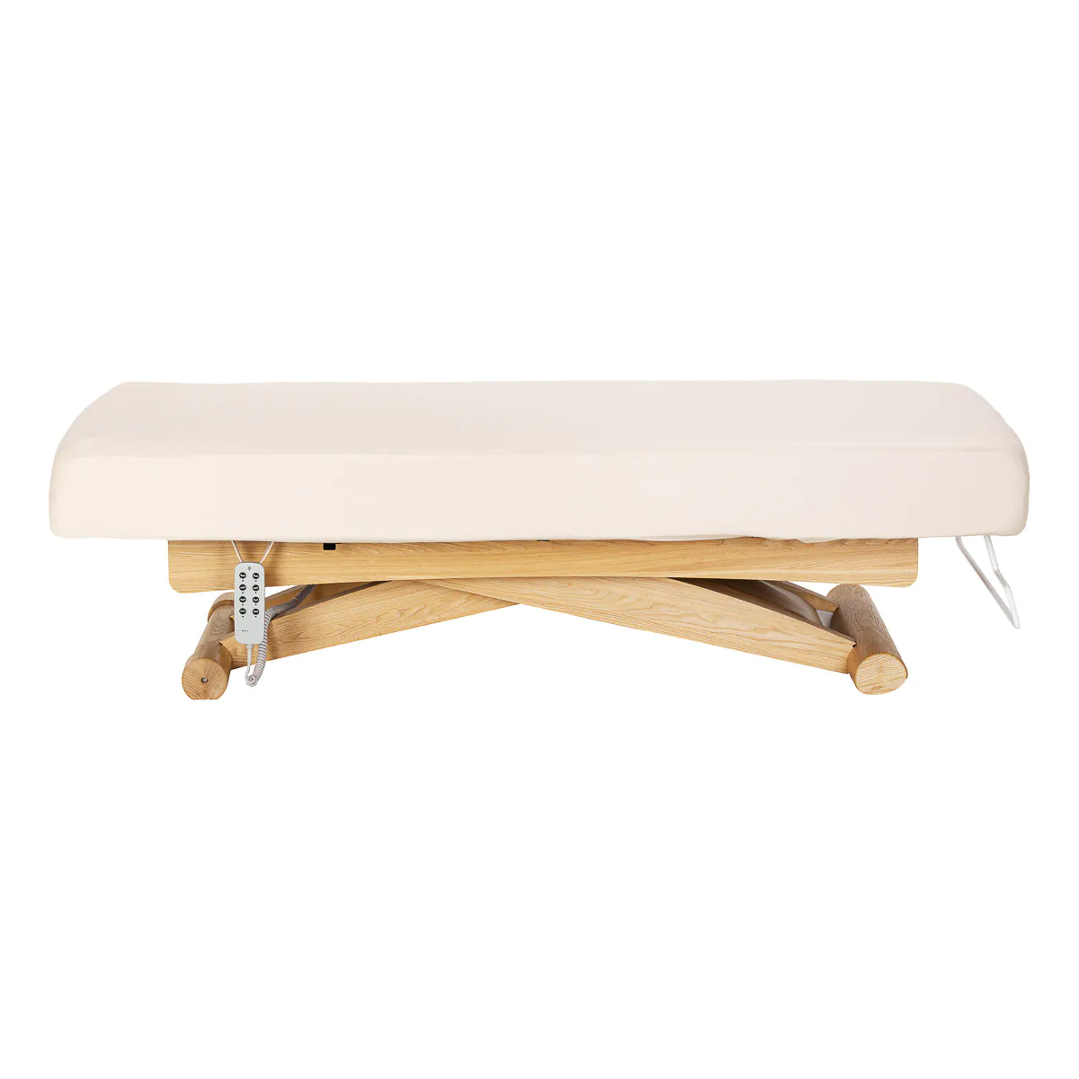 Široka ležalna površina in debelo, mehko oblazinjenje zagotavljata stabilno podporo celotnemu telesu. Profilirana površina mize omogoča naraven položaj telesa in preprečuje napetost med tretmajem. Dodatni nasloni za roke povečujejo udobje ter omogočajo bolj sproščen položaj telesa.